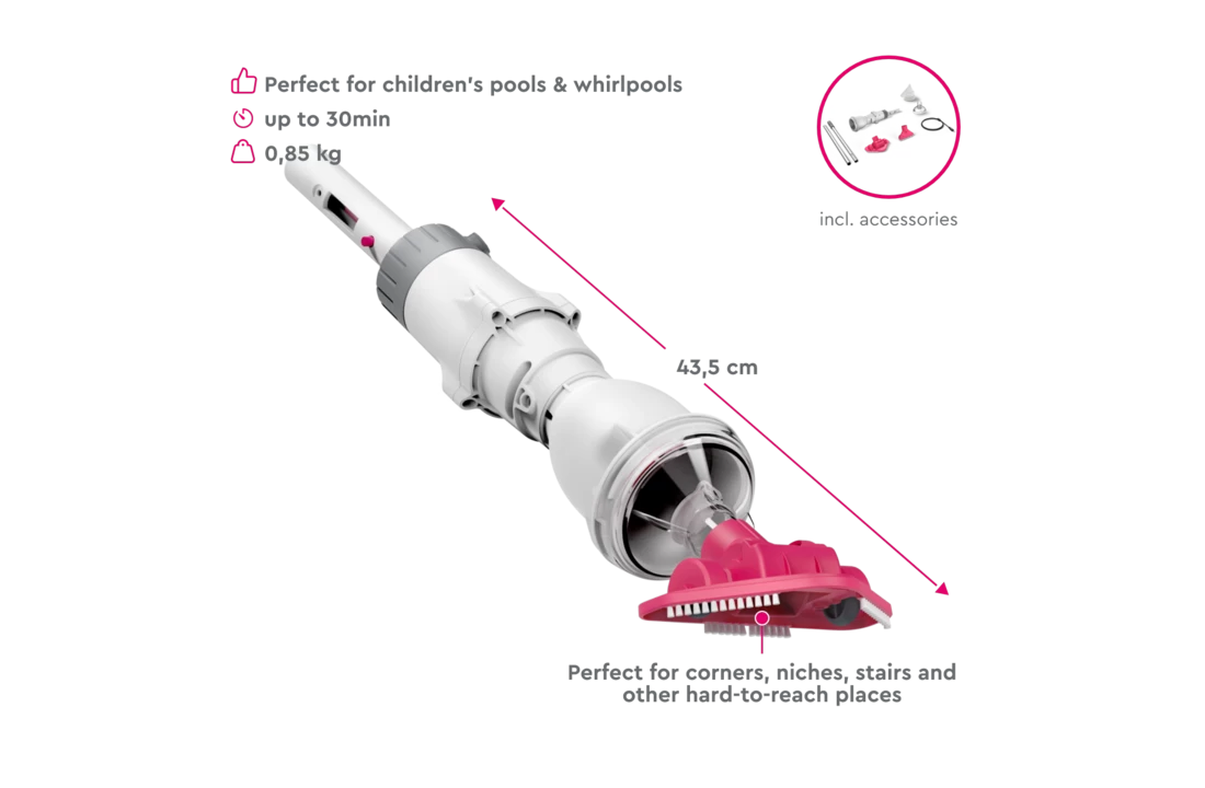 Deze stofzuiger heeft een krachtige zuigkracht en driehoekige borstelkop voor een efficiënte en gemakkelijke reiniging van zwembaden tot 10 m³. - Draadloos gebruikt: