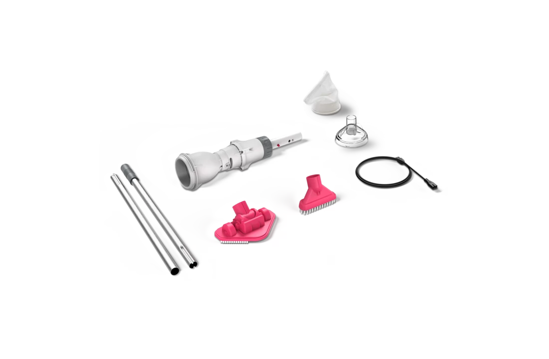 Zwembadstofzuiger, oplader, stok en platte borstelbevestiging met 2 jaar garantie.