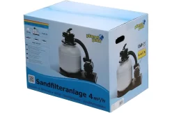 Sterk en duurzaam PE glasvezelversterkte polyester tank met top mount 6-weg klep en centrifugaal pomp met voorfilter. Gemonteerd op bodemplaat. Werkdruk 2,5 bar.