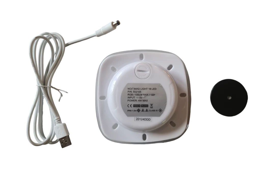 De No(t)mad lamp heeft de kleur wit, en kan eenvoudig worden opgeladen via de meegeleverde USB-oplaadkabel.